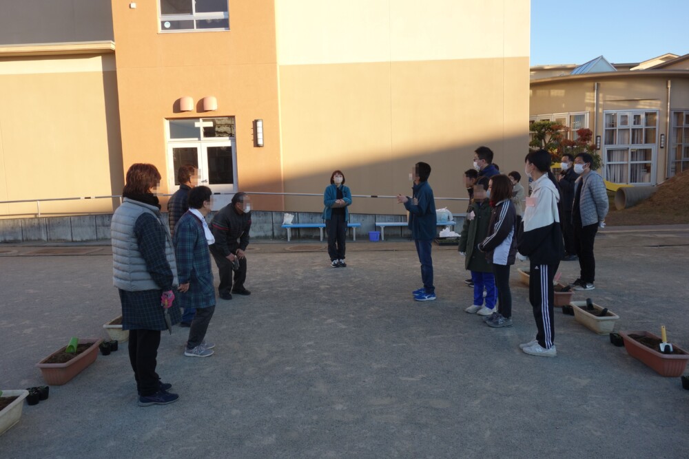 12月9日(月)に本校グラウンドにて、舎生4名と池田地区シニアクラブの方々4名が参加し、ビオラの花植えを行いました。前回は6月に松葉ボタンの花植えを行い、今年度は今回で2回目の地域交流会となりました。