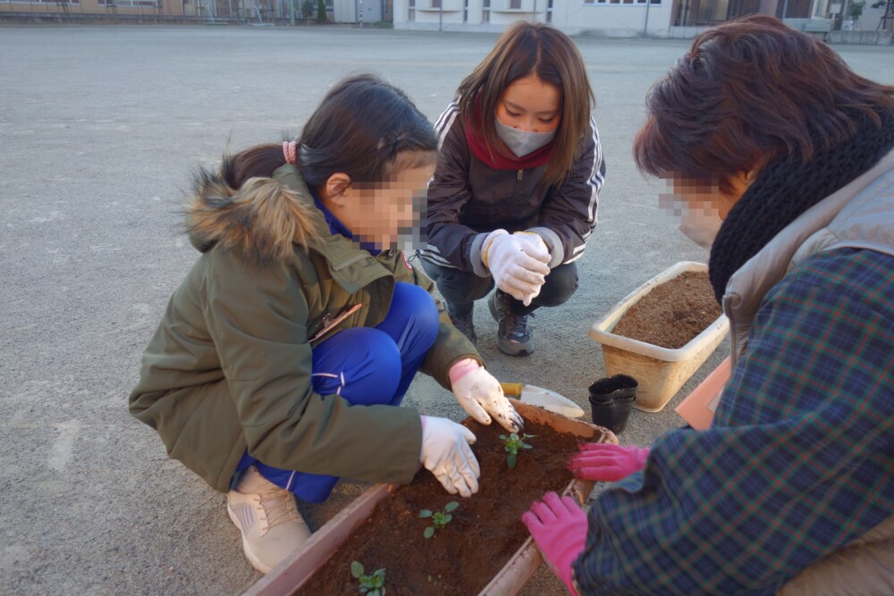 最初に、シニアクラブの方から、ビオラのことや育て方について教えていただき、その後、プランターへの植え付け作業を一緒に行いました。楽しく作業をしながら、シニアクラブの方々と談笑して交流を深めることができました。