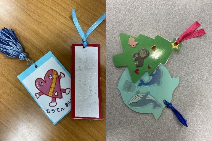 今回は、図書委員が作ったしおりもプレゼントしました。しおりは、点字のもの、クリスマスツリーをかたどったもの、盲学校のマスコット・もうてんあいちゃんのイラスト入りのものなど、みんなで協力して作りました。