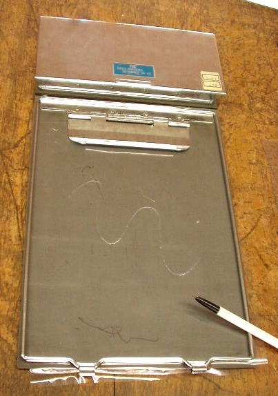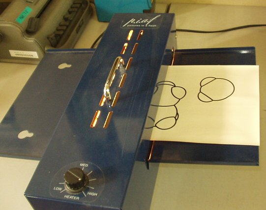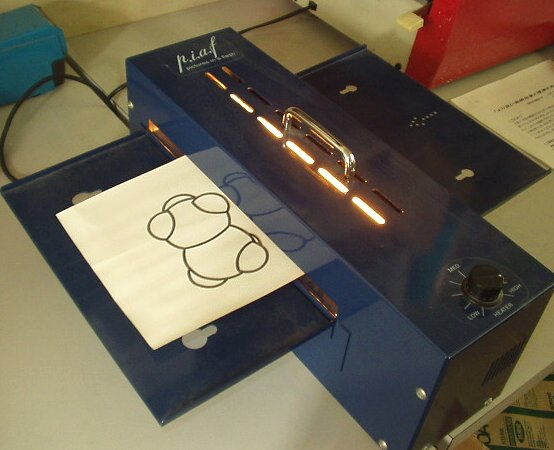 | 表面作図器:シリコンマットの上に、セロハン紙を置き、ボールペンで書くとひっかいたようになって、書いた線が手で触って確認できるようになる | @図を普通の紙にペンで書く Aそれを特殊加工された紙にコピーする Bこのコピーのカーボンが特殊インクと反応して加熱されると浮き出るという仕組み C図が浮き出て、触ってもわかるようになる |